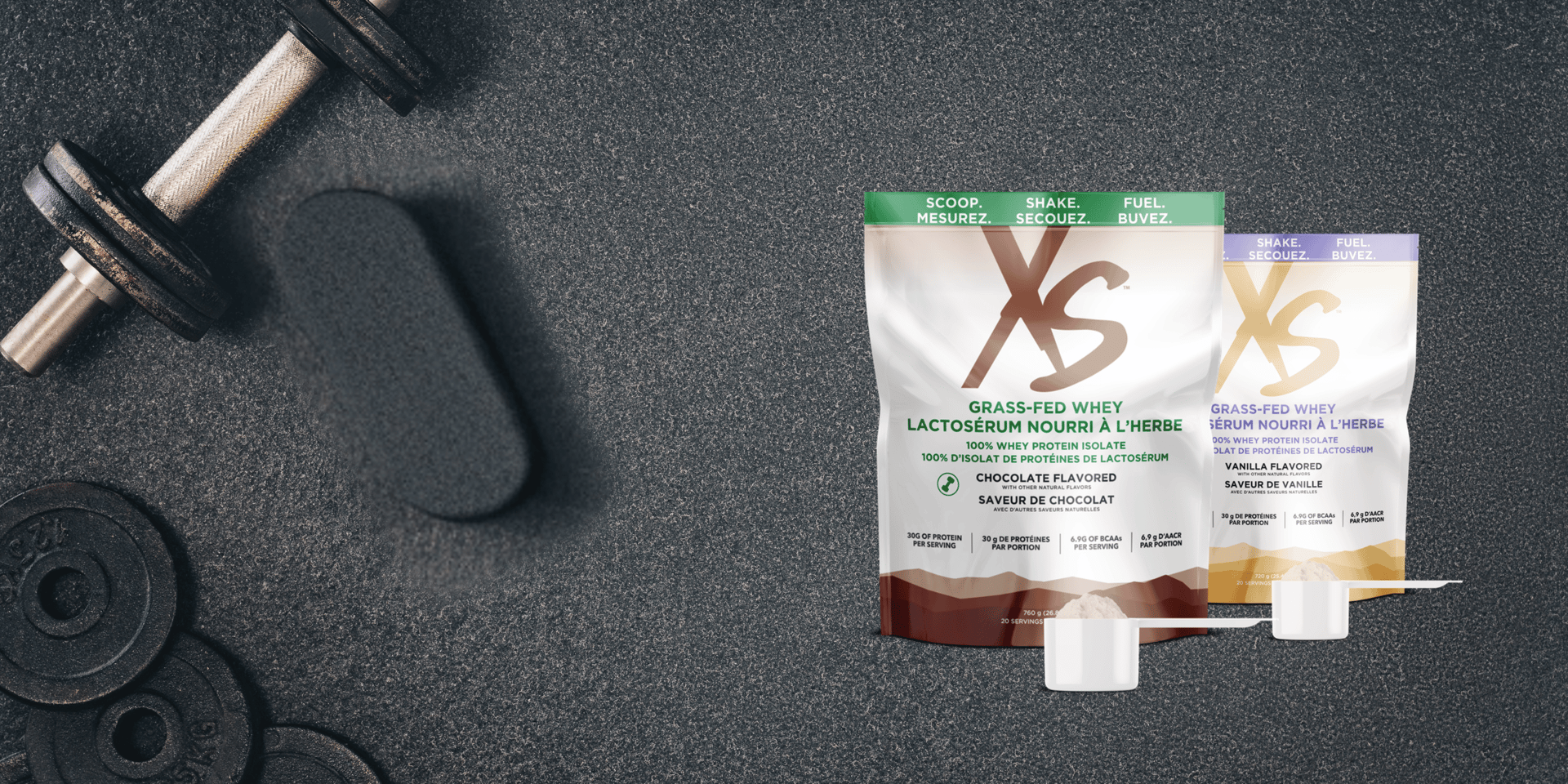 IND YOUR POWER WITH XS™ GRASS-FED WHEY – Contains 30 grams of premium whey protein derived from the milk of grass-fed cows and 6.9 grams BCAAs.